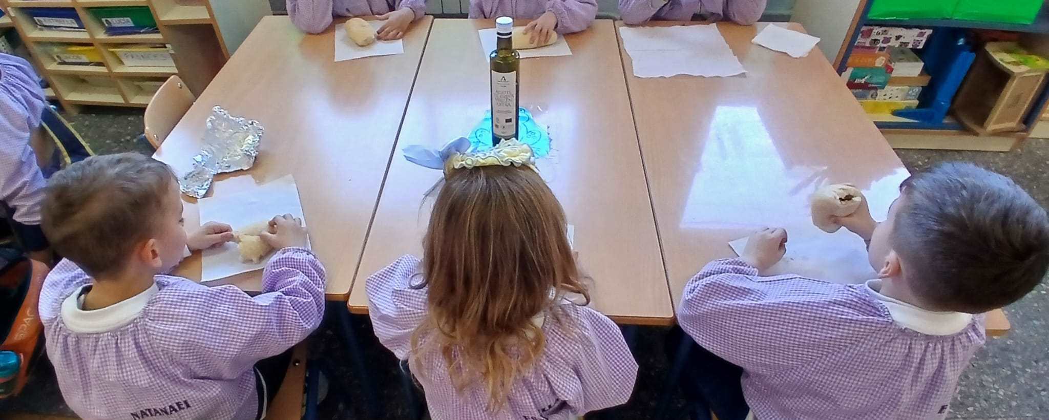 La mañana comenzó con un aroma inconfundible: el del pan recién hecho (financiado por nuestro Ampa) y el aceite de oliva virgen extra (donado al centro),